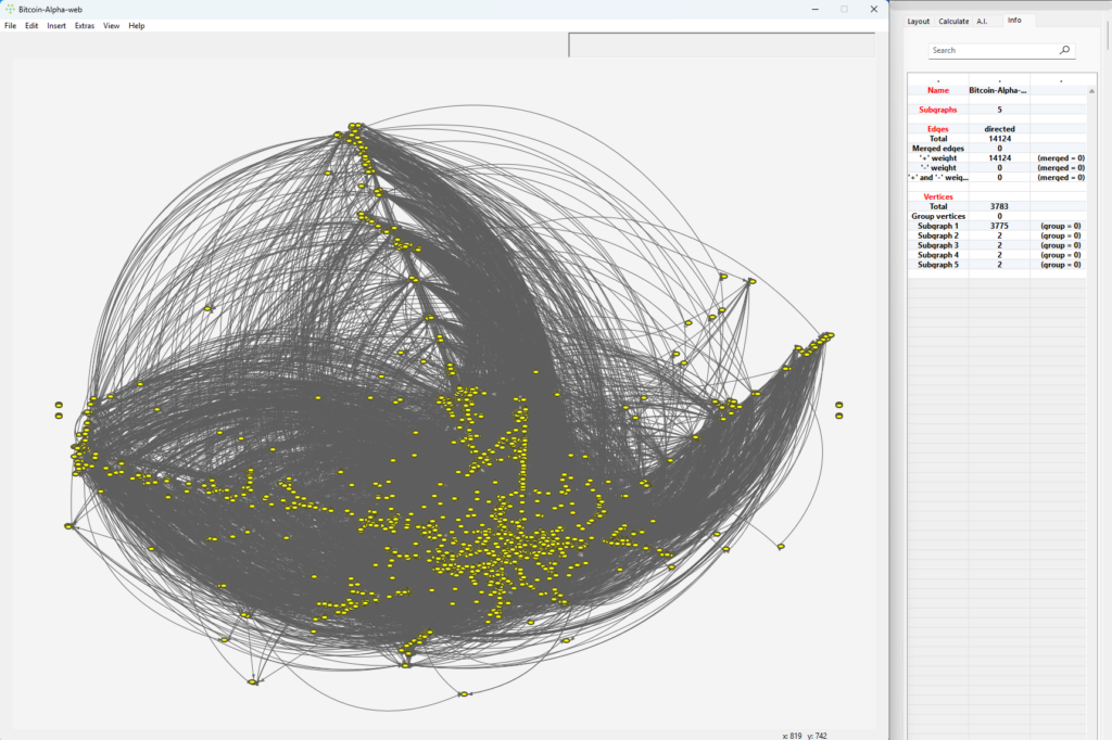 The screenshots show the user interface with graph visualizations and the results of some common analyses (Features)